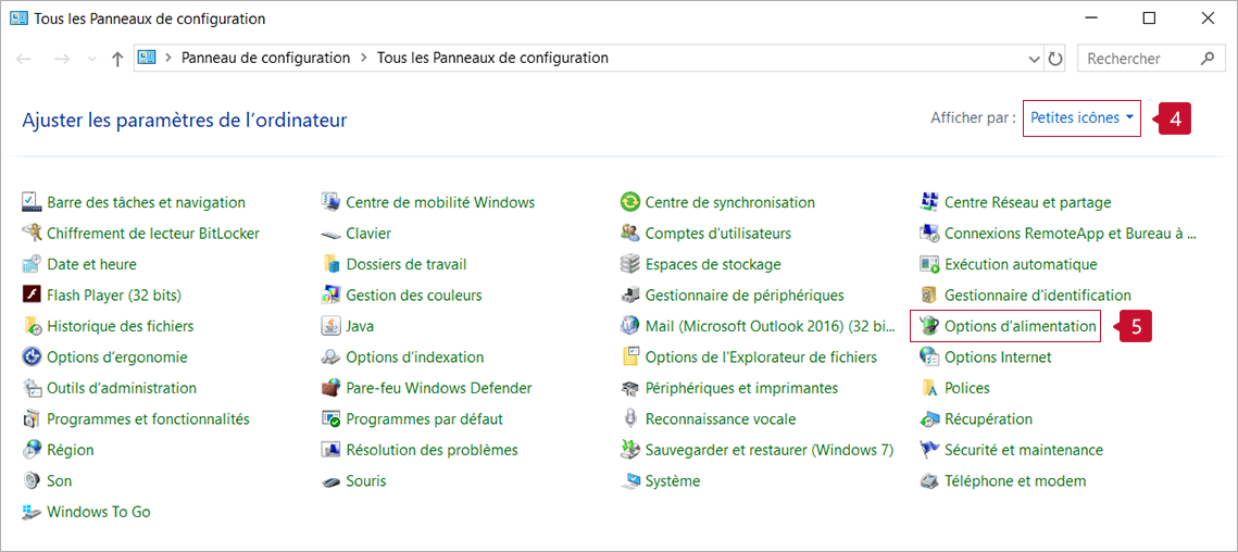 2. Affichez par Petites icônes et cliquez sur Options d'alimentation.