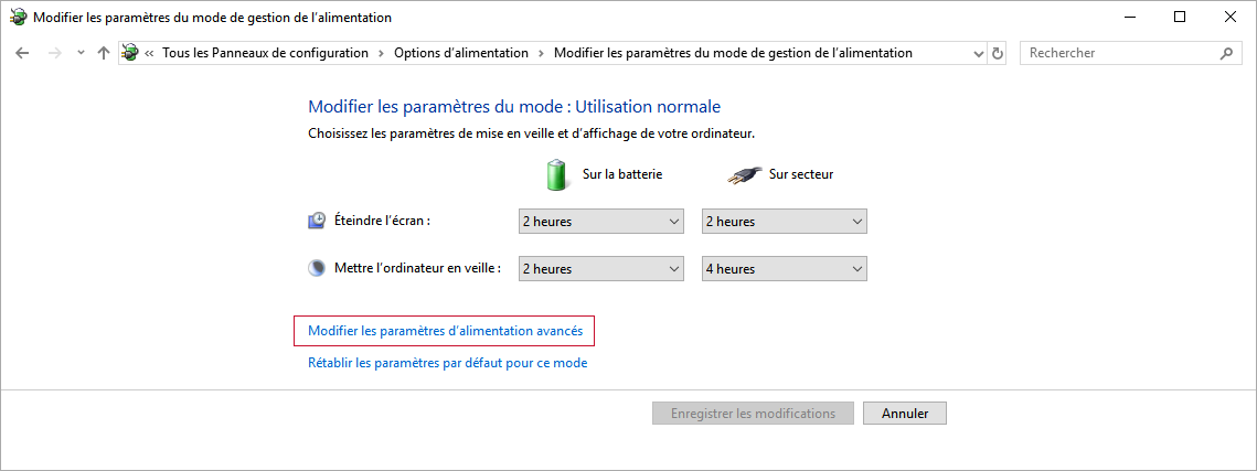 4. Cliquez sur Modifier les paramètres d'alimentation avancés.