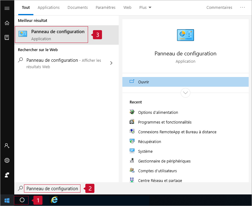 1. Entrez « panneau de configuration » dans la zone de recherche et cliquez sur Panneau de configuration.