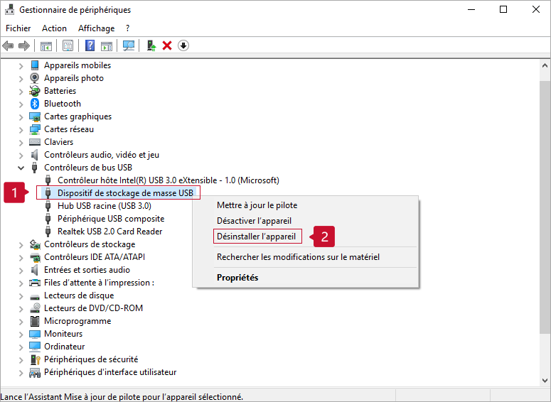 Ouvrez le Gestionnaire de périphériques, développez Contrôleurs de bus série universel, cliquez sur Périphérique de stockage de masse USB > Désinstaller le périphérique, puis réinsérez le périphérique USB.