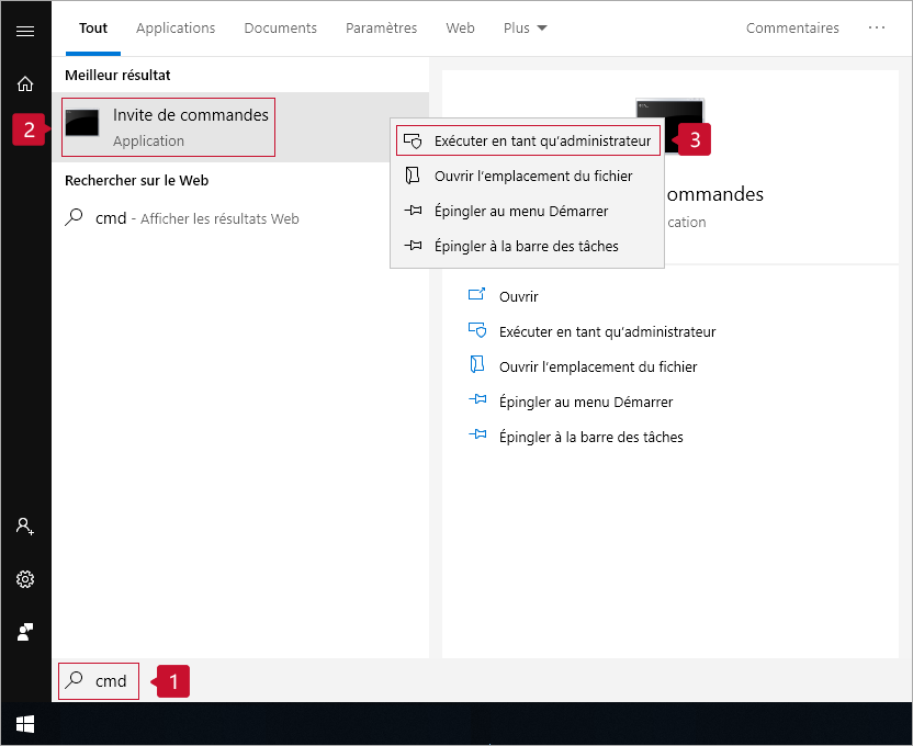 2. Entrez « cmd » dans la zone de recherche, cliquez avec le bouton droit sur Invite de commandes et choisissez Exécuter en tant qu'administrateur.