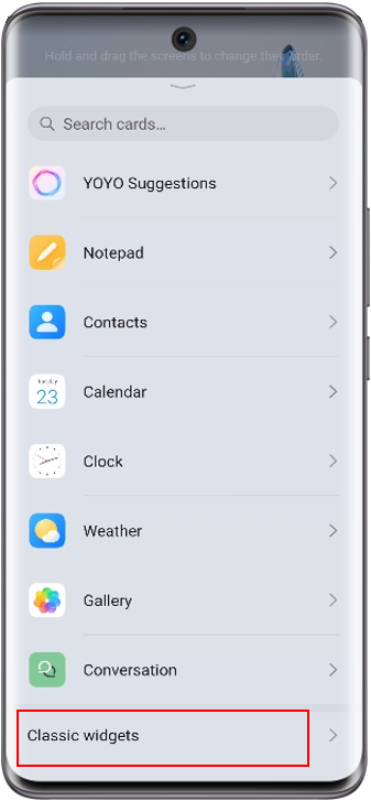 For the Magic UI 6.0 version or later, pinch the home screen with two fingers, tap Cards, and swipe to the bottom. Tap to access Classic widgets. Then tap or drag a widget you need to add it to the home screen.