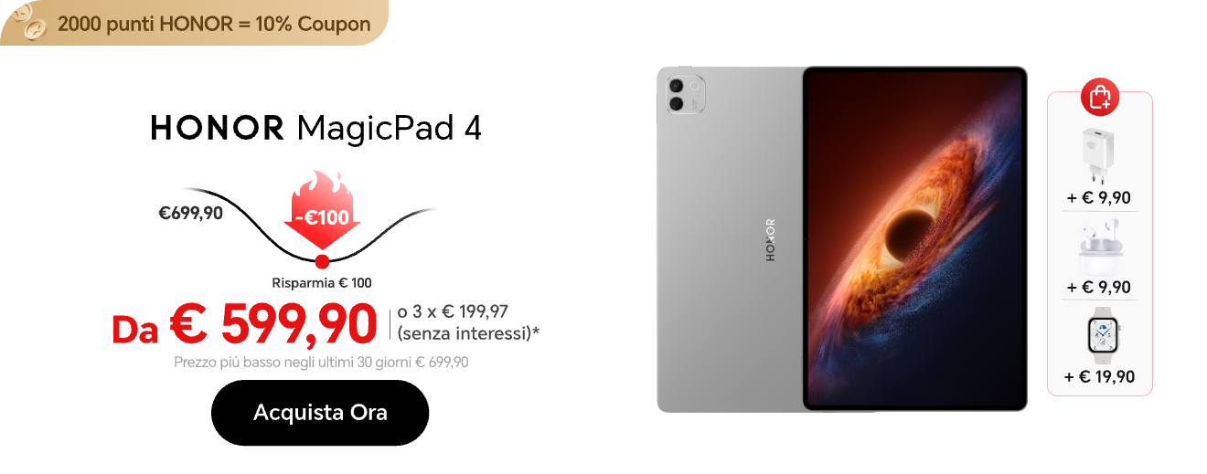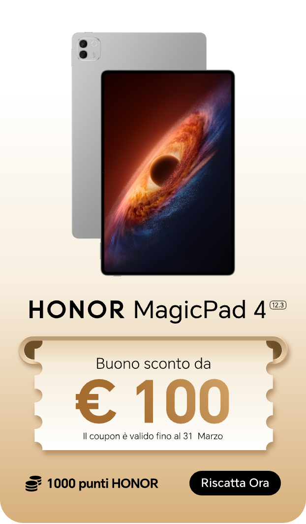 Accetto di ricevere le ultime offerte e informazioni sui prodotti, gli eventi e i servizi Honor su piattaforme terze (Facebook, Google). Posso revocare il mio consenso in qualsiasi momento come indicato nell'Informativa sulla privacy.