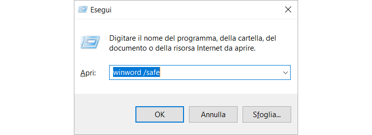 Per eseguire Word nella finestra Esegui, inserisci winWord /safe; per eseguire Excel, inserisci excel /safe; per eseguire PowerPoint, inserisci powerpnt /safe.