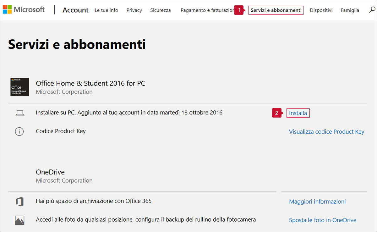 3. Nella schermata Servizi e abbonamenti, fai clic su Installa sul lato destro del prodotto Office e segui le istruzioni sullo schermo per installare le app di Microsoft Office del caso.