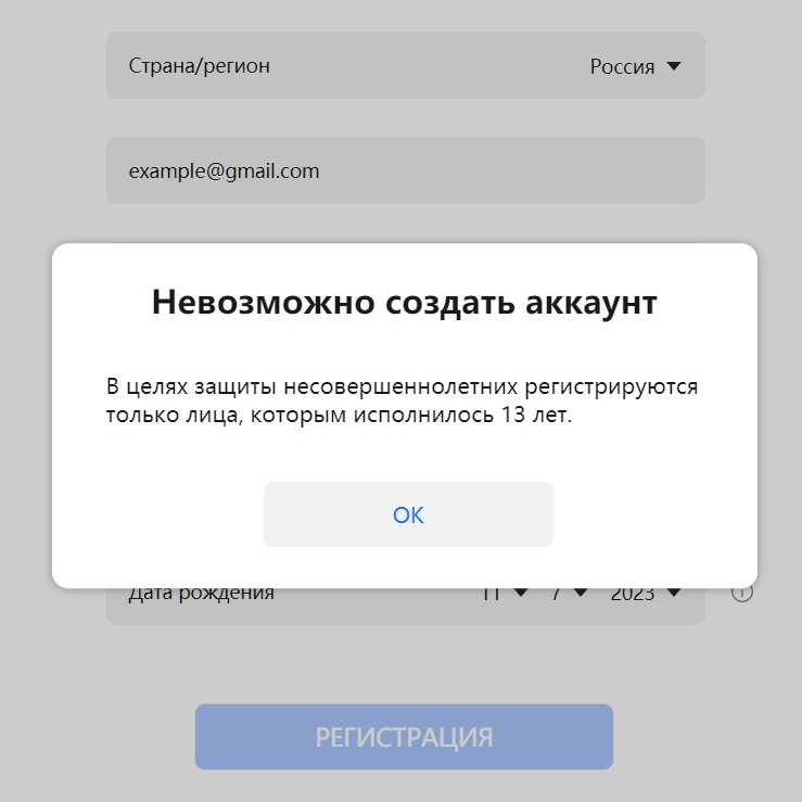 - Невозможно создать аккаунт В целях защиты несовершеннолетних регистрируются только лица,которым исполнилось 13 лет.