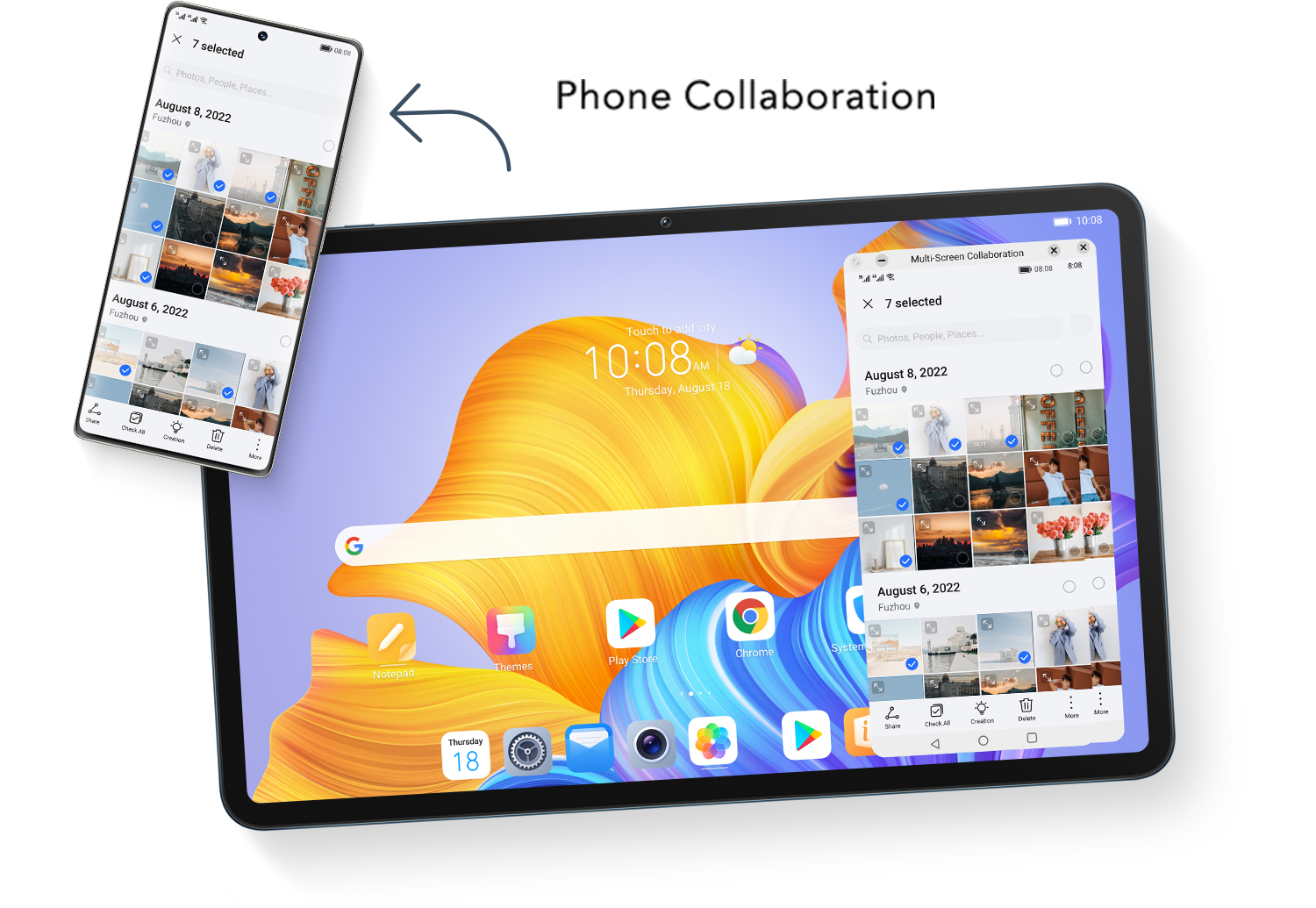 عبر HONOR Pad 8 يمكنك مزامنة هاتفك من هونر بكل سهولة مع التابلت وفتح شاشة الهاتف في التابلت ونقل الملفات والبيانات بينهما بكل سهولة عبر خاصية "السحب والافلات" كما يمكنك تصفح الرسائل ومشاهدة الاشعارات والتحكم في الهاتف عبر شاشة HONOR Pad 8