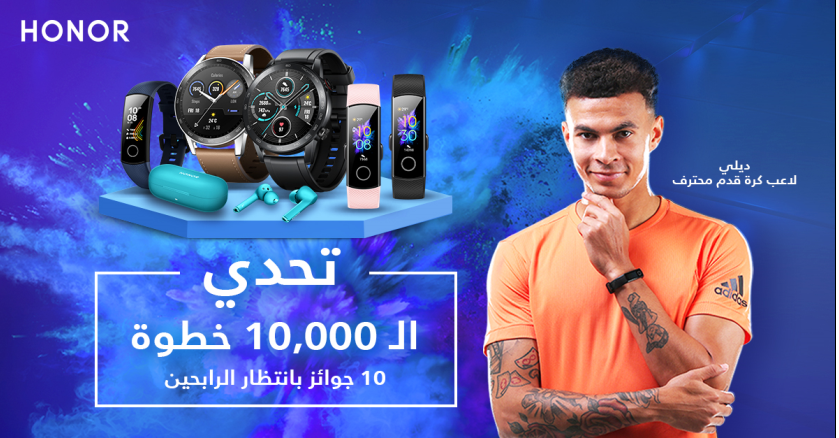 شاركنا صورة من الـ #Band5 الخاصة بك او من هاتفك الذكي لتحقيقك لـ 10,000 خطوة يومياً في التعليقات وسيكون هناك معنا 10 فائزين بسوار #HONORBand5