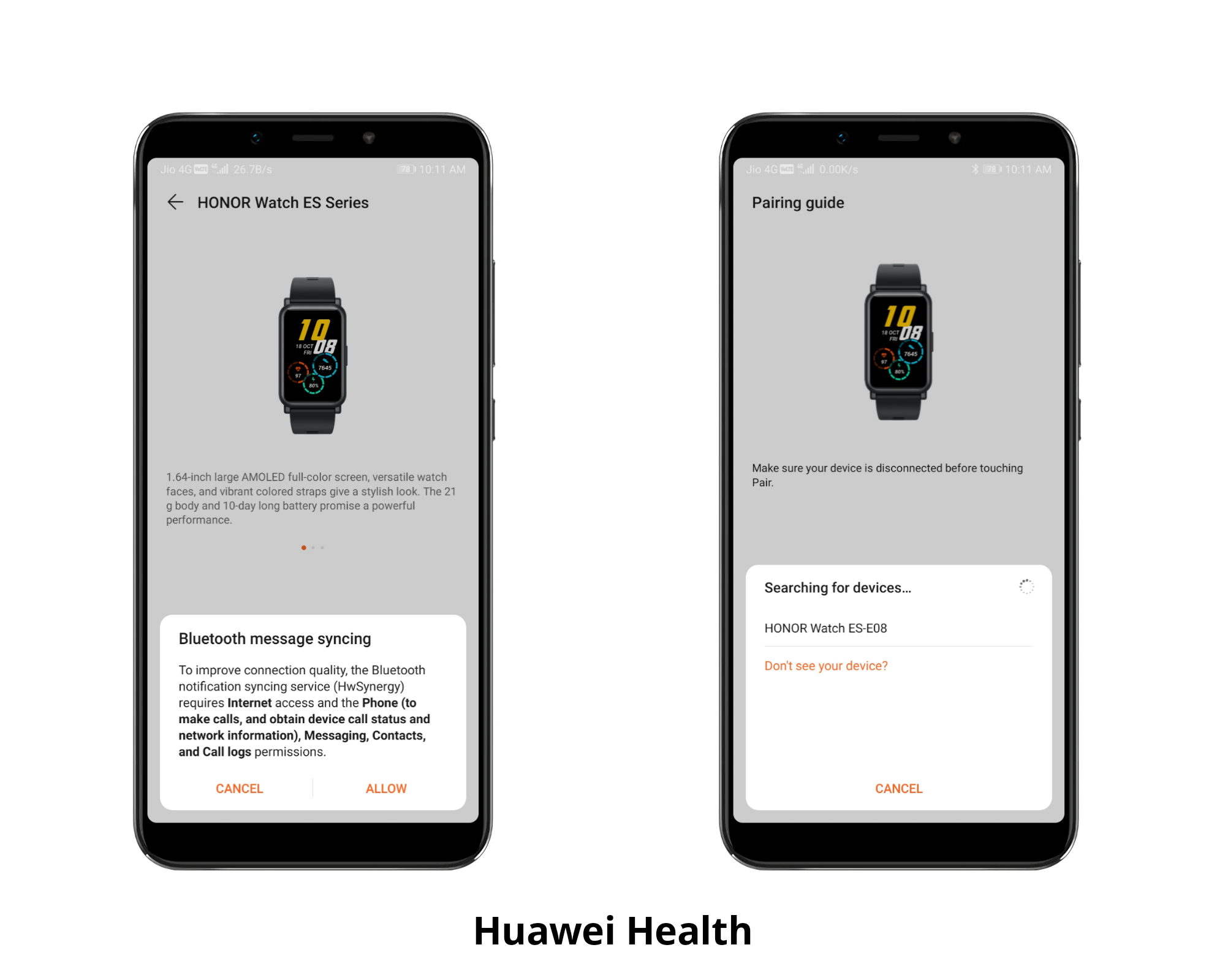 انقر على "إقتران" لإقران الساعة بهاتفك الذكي والسماح "بمزامنة الرسائل عبر البلوتوث". سيبحث عن الأجهزة وانقر على اسم الجهاز للإقران. (هنا ، إنها ساعتي الرائعة HONOR WATCH ES)