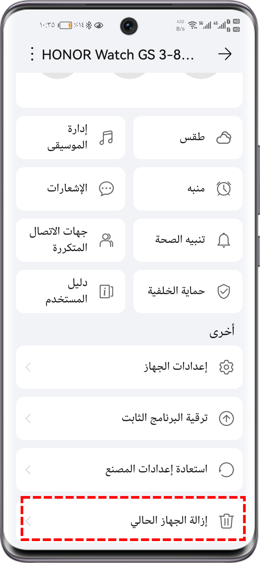 ملاحظة: لن تؤثر عملية إزالة الجهاز هذه على استخدام الجهاز. ومع ذلك، سيتم مسح معلومات جهات الاتصال المفضلة في تطبيق الصحة من HONOR لديك ولن يتم استردادها حتى لو أعدت الاتصال بالجهاز. لذا، ينبغي لك التصرّف بحرص.
