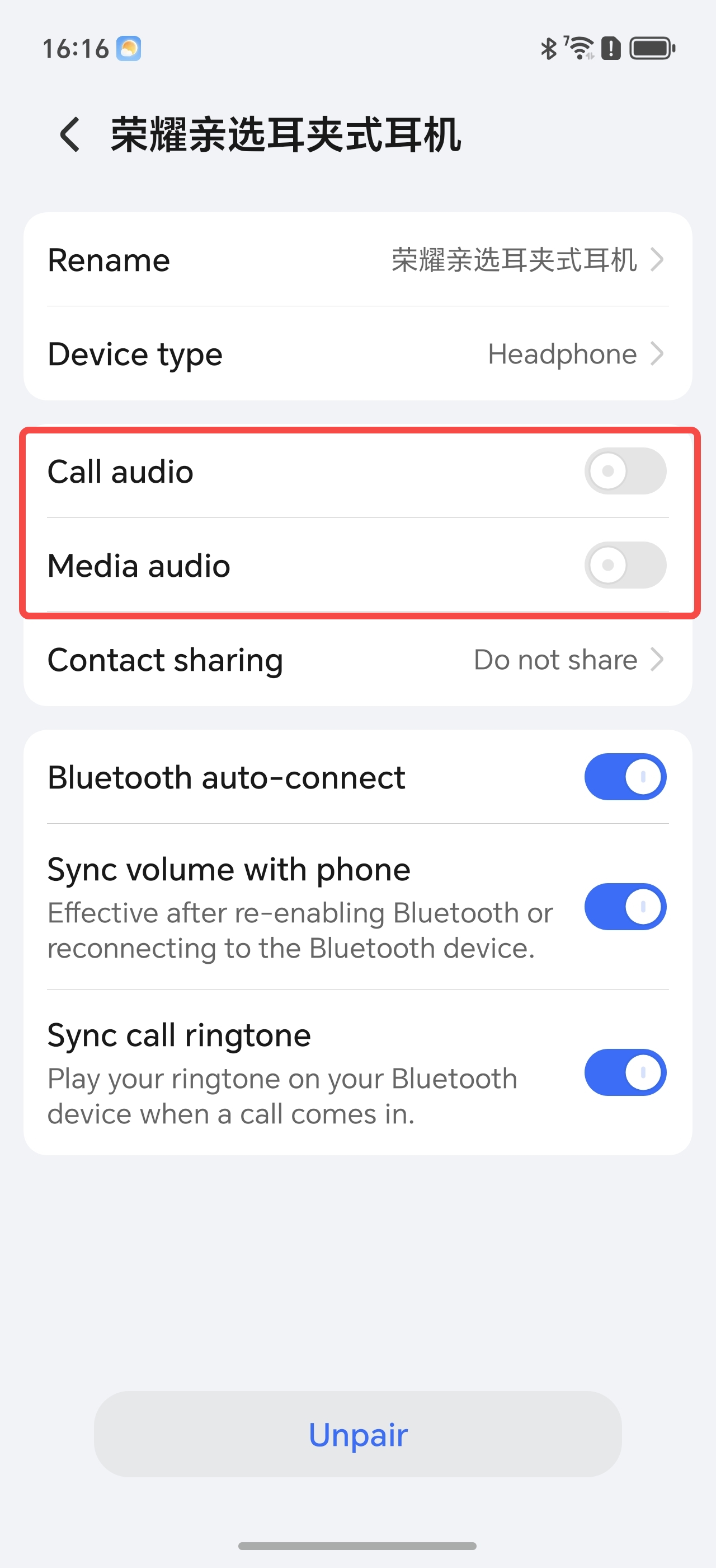 If you do not want the Bluetooth device to automatically connect to your phone when it is powered on, you can manually turn off the Call audio and Media audio switches in the device details when connecting the Bluetooth device to your phone.