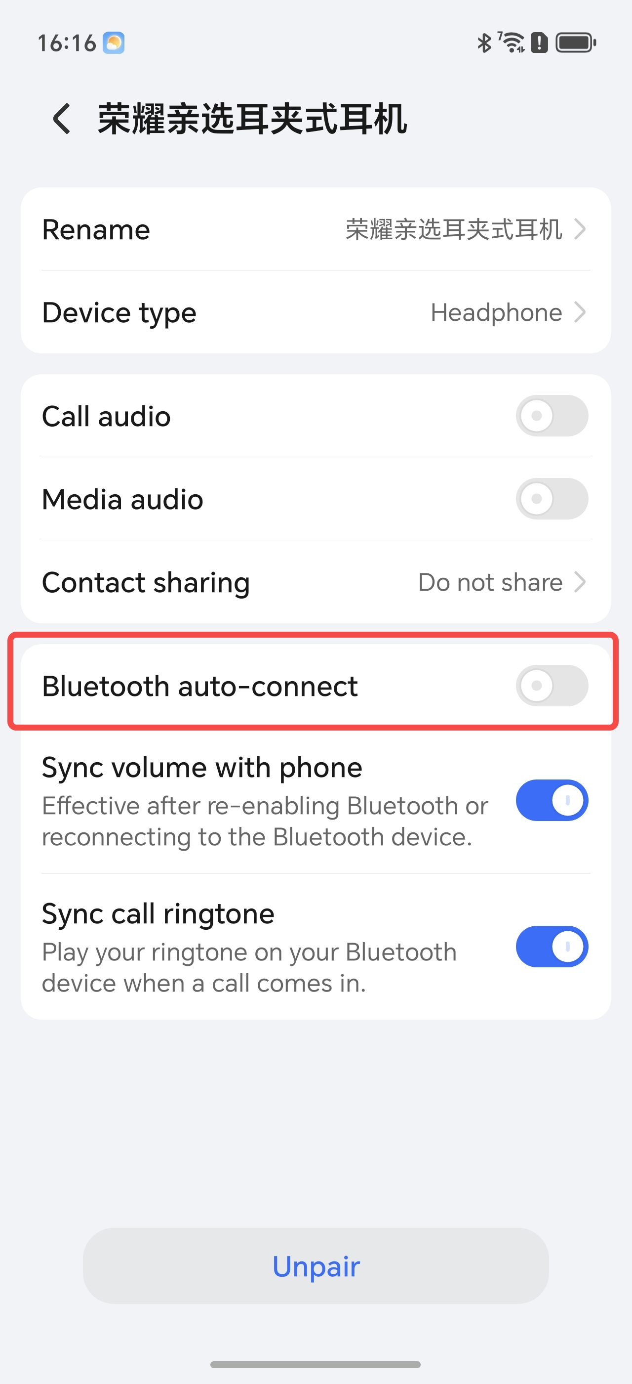 Even after turning off the Bluetooth auto-connect switch in the Bluetooth device details, the Bluetooth device still automatically connects to the phone when powered on.