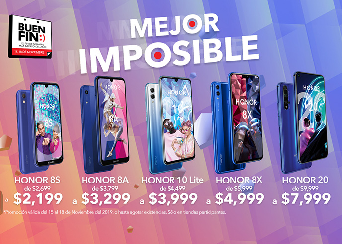 [Ciudad de México a 5 de noviembre de 2019.] – HONOR, la compañía de dispositivos móviles, anuncia grandes descuentos durante la temporada de Buen Fin en los precios del HONOR 8A, HONOR 8S, HONOR 8X, HONOR 10 Lite y su más reciente lanzamiento, el HONOR 20.