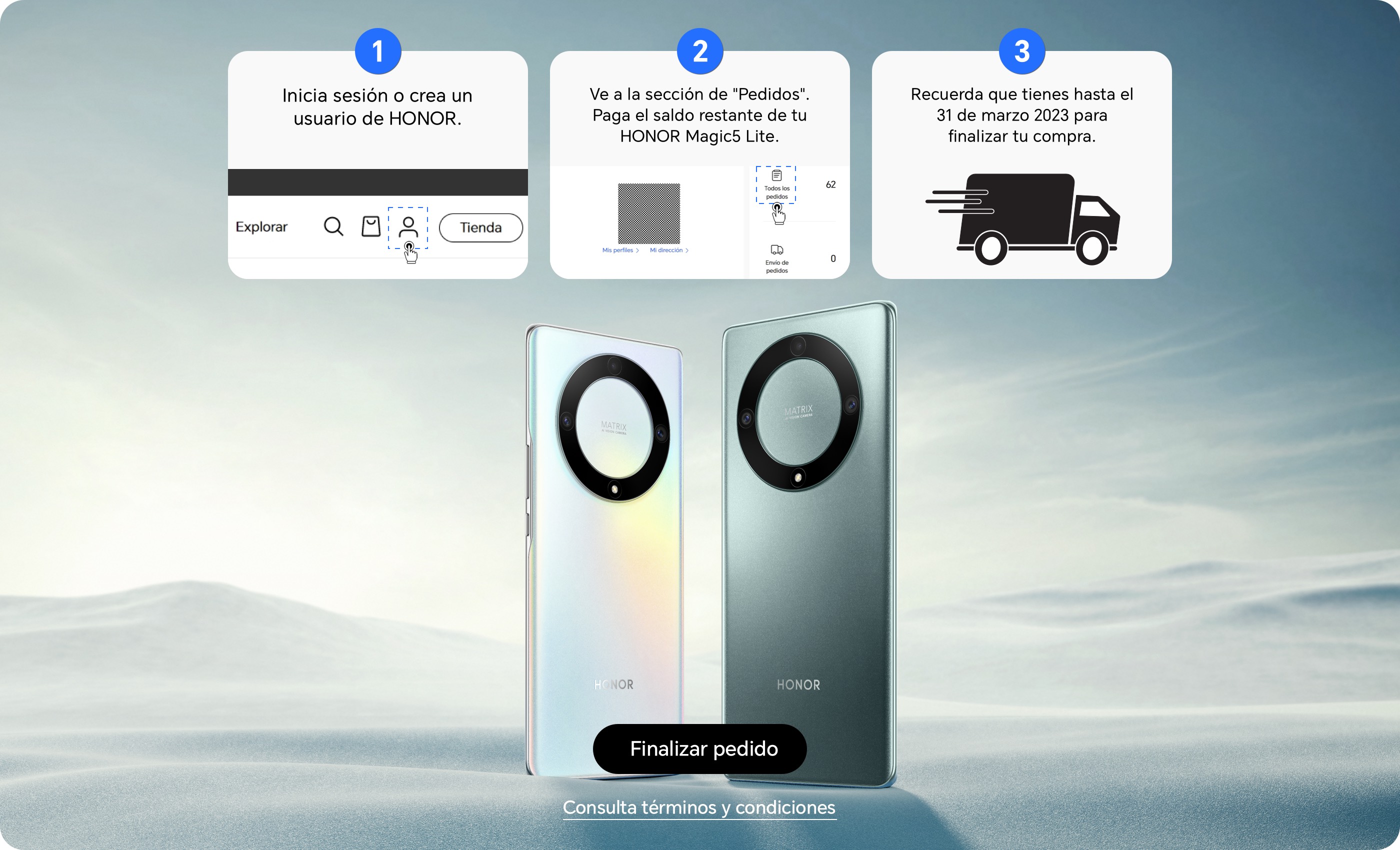 Acepto recibir las últimas ofertas e información sobre los productos HONOR a través de correo electrónico o mensajería instantánea (por ejemplo, WhatsApp) que se indica a continuación, así como la publicidad en plataformas de terceros. Entiendo que puedo cancelar mi suscripción en cualquier momento de acuerdo con el Capítulo 5 de la . Declaración de privacidad de la Plataforma HONOR.