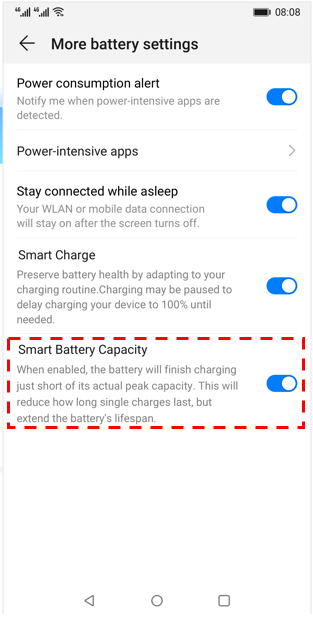 Si se habilita Capacidad de batería inteligente, el sistema administra de manera inteligente la capacidad de uso máximo de la batería según el estado de deterioro de la misma, con lo que se disminuye la velocidad del envejecimiento. Esta función podría afectar un poco el desempeño de la batería, pero aún se recomienda habilitarla para extender la vida útil de la batería. Para hacerlo, vaya a: