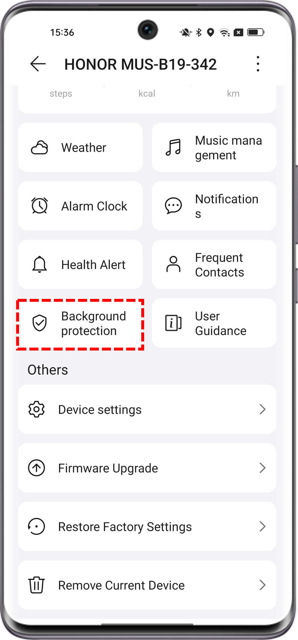 Si su celular no es un teléfono de la marca HONOR, es posible que la aplicación Health se desconecte del dispositivo debido a la falta de protección de aplicaciones en segundo plano. Puede habilitar la protección en segundo plano según las indicaciones en Health> Dispositivo > Dispositivo conectado > Protección en segundo plano.