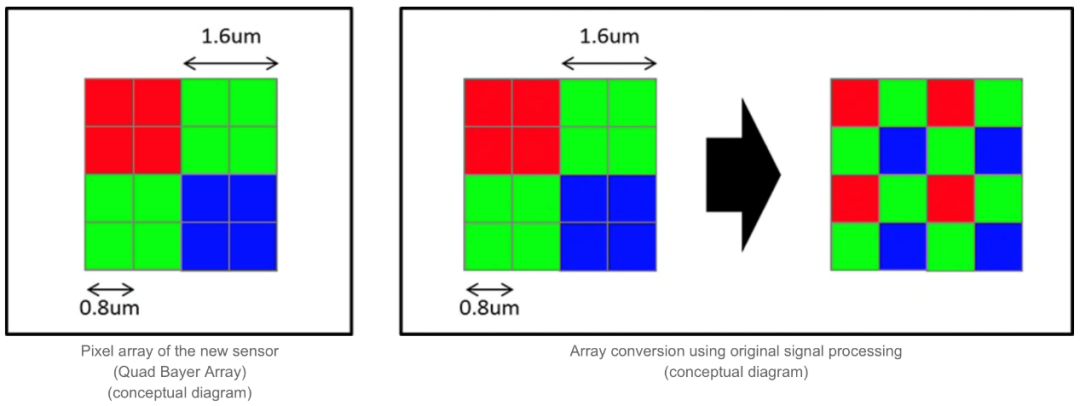 The Quad Bayer array is used to output binned 2x2 pixels and increase the photosensitive surface to the level equivalent to that of a 1.6μm pixel, thereby significantly improving the IMX586's light capturing capability and reducing image noise in low light conditions.