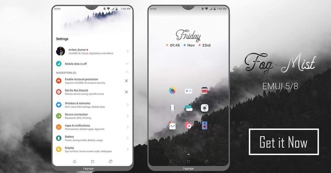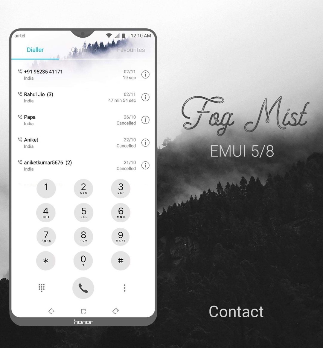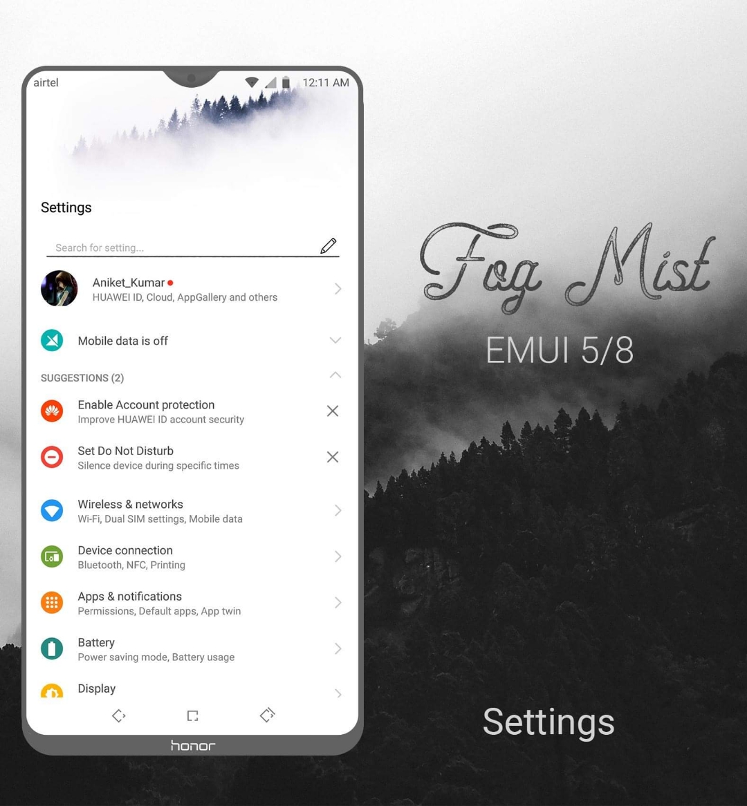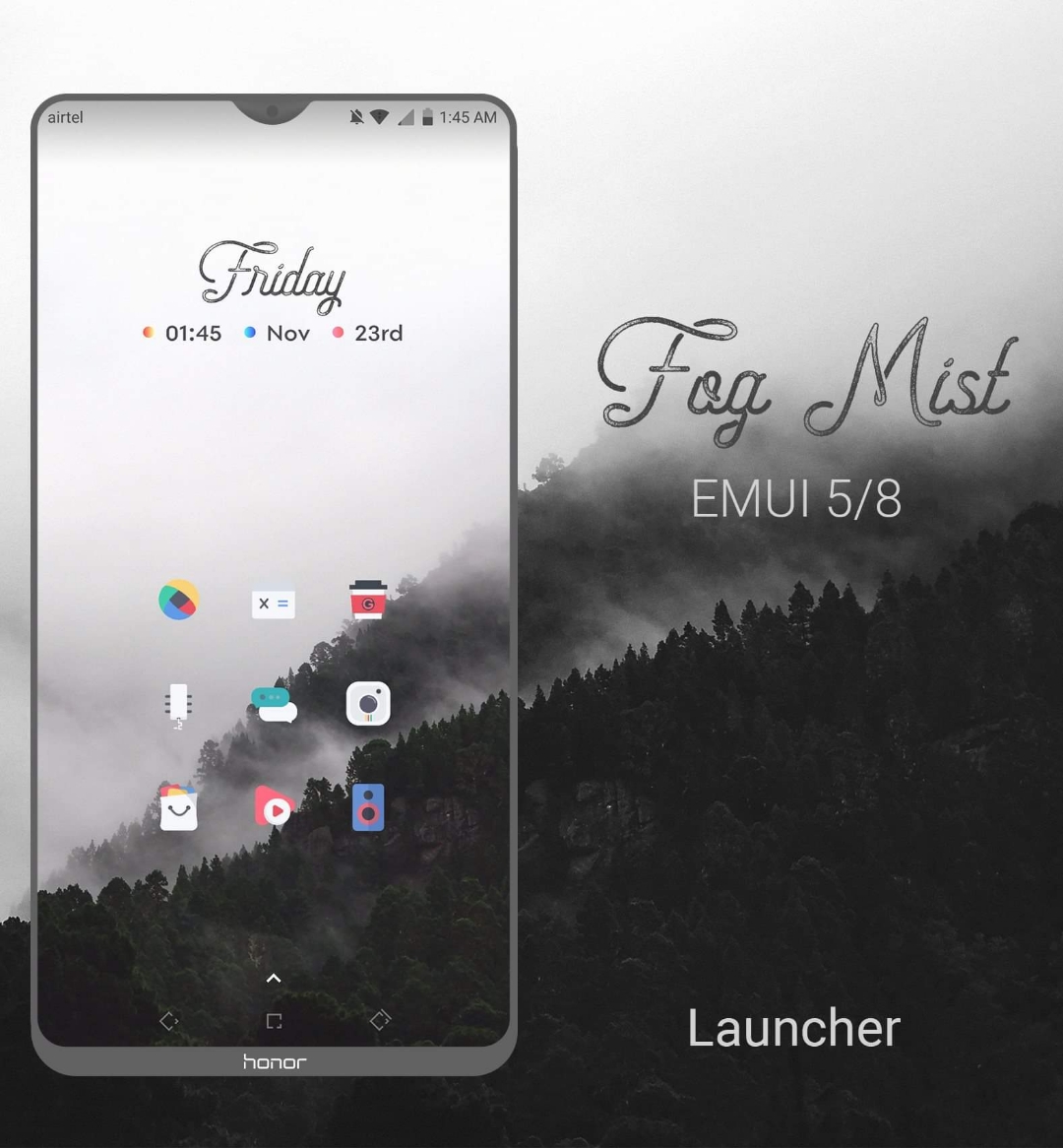 Note: **Internet Connection Required to Open the Programme** Fog Accent theme for EMUI 5/8 users Enjoy Cold Fog-Mist theme on your Huawei/Honor device running EMUI 5/8 on the top How to Fix Common issues? Battery issue? -Restart your device ATTENTION: - Above theme is designed for EMUI 8/5 , Please check your device EMUI version before installing it in your device Widget used: Fuchsia KWGT - Gradient Launcher: Nova Launcher Get the theme from here https://play.google.com/store/apps/details?id=emui.en.com.fog
