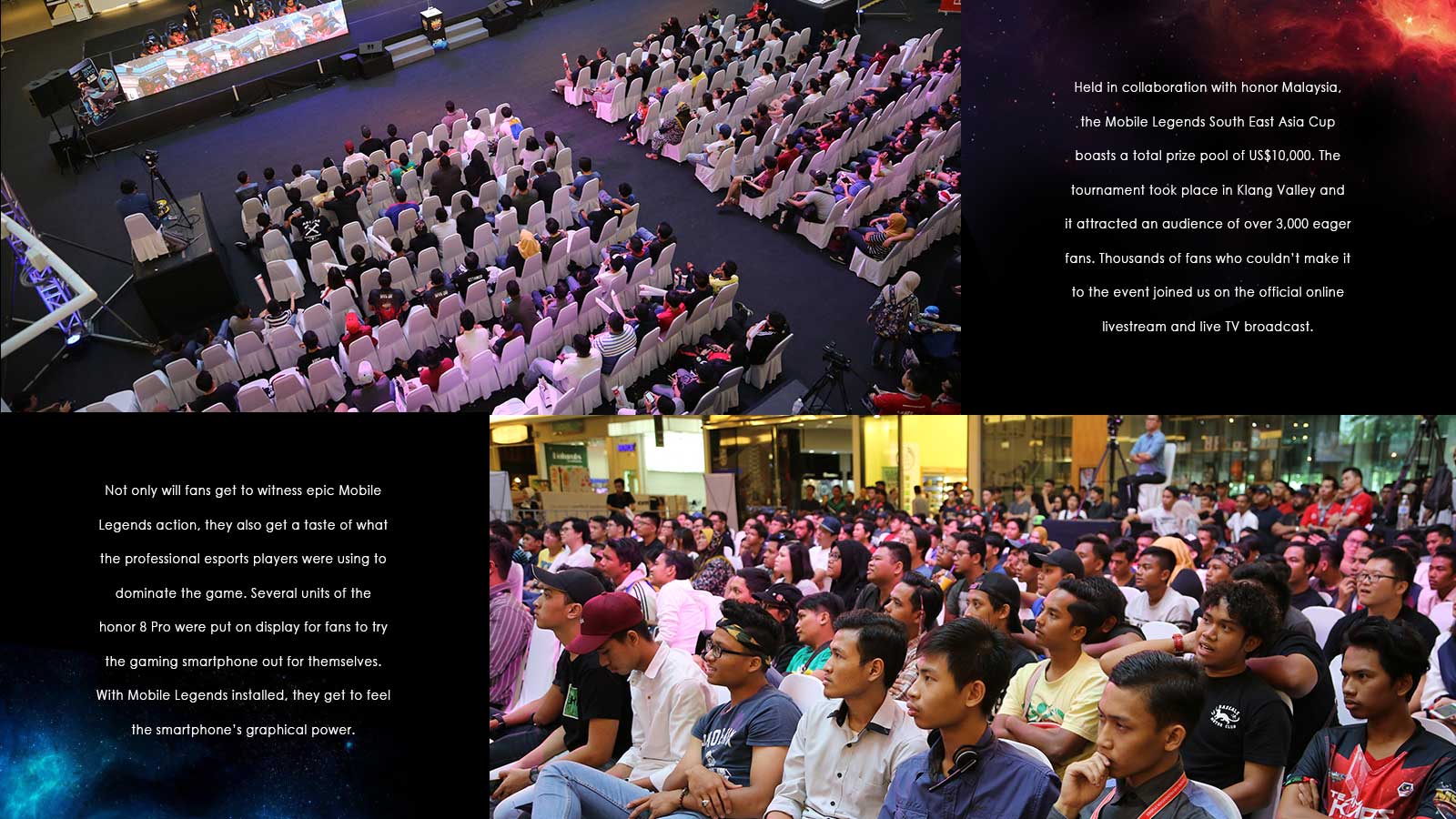Held in collaboration with honor Malaysia, the Mobile Legends South East Asia Cup boasts a total prize pool of US$10,000. The tournament took place in Klang Valley and it attracted an audience of over 3,000 eager fans. Thousands of fans who couldn’t make it to the event joined us on the official online livestream and live TV broadcast.