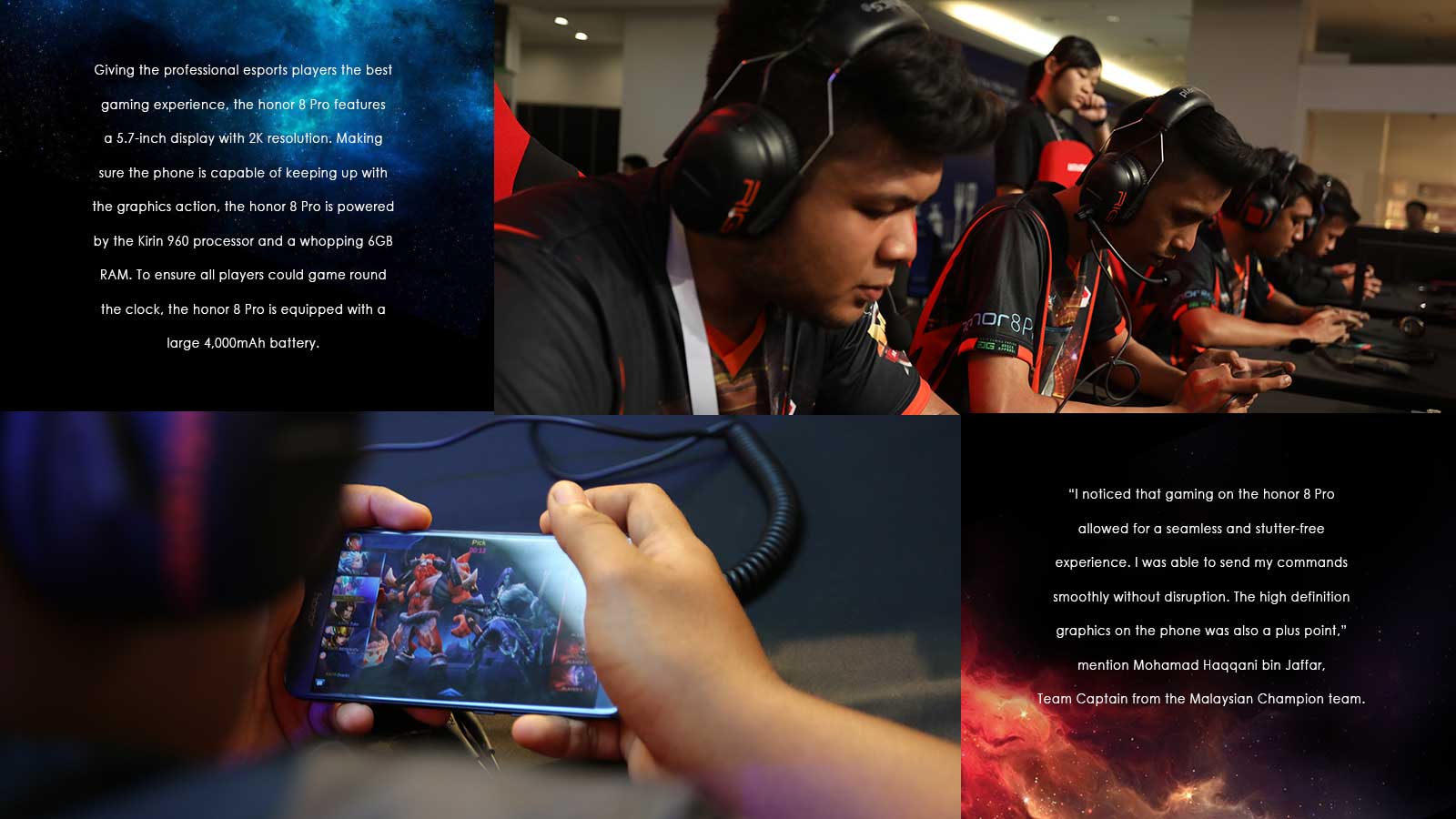 “I noticed that gaming on the honor 8 Pro allowed for a seamless and stutter-free experience. I was able to send my commands smoothly without disruption. The high definition graphics on the phone was also a plus point,” mention Mohamad Haqqani bin Jaffar, Team Captain from the Malaysian Champion team.