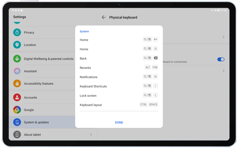 When a physical keyboard is connected, you can check the list of supported shortcuts in the following path: