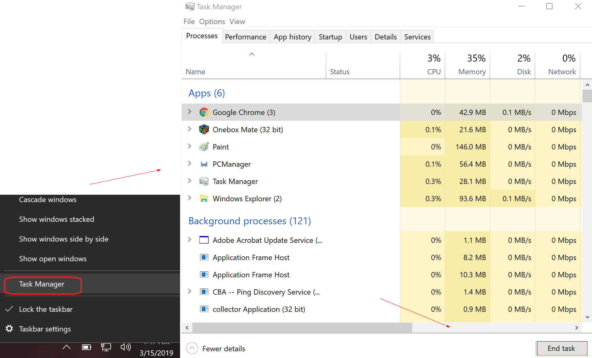Right-click any blank area on the taskbar and click Task Manager. Select apps and programs with high CPU usage, and then click End Task, or right-click the app or the program and click End Task.