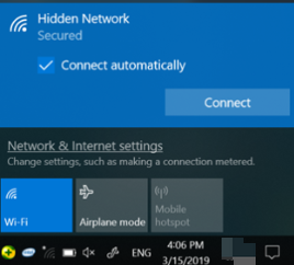 1. Click the network icon in the bottom-right corner, click Hidden Network, and then click Connect.