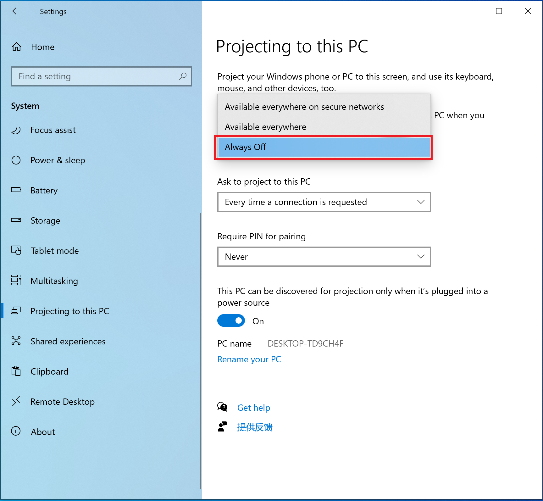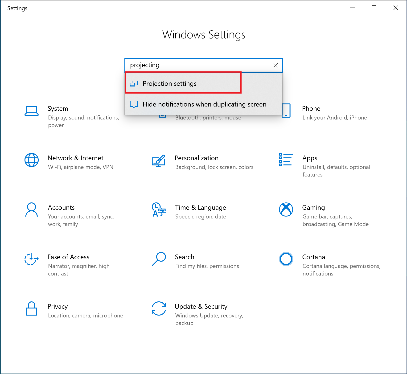 1. Click Settings to enter the Windows Settings page, search for "Projection settings" and enter the page.