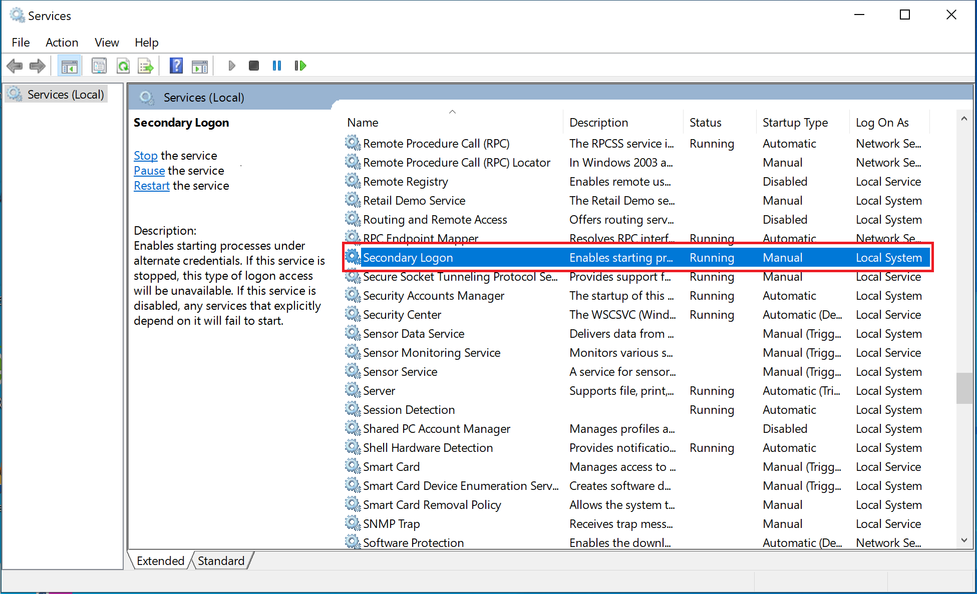 On the Extended tab page, find Secondary Logon and check whether it is in the Running state. If the Secondary Logon service is in the Stopped status, manually start it.