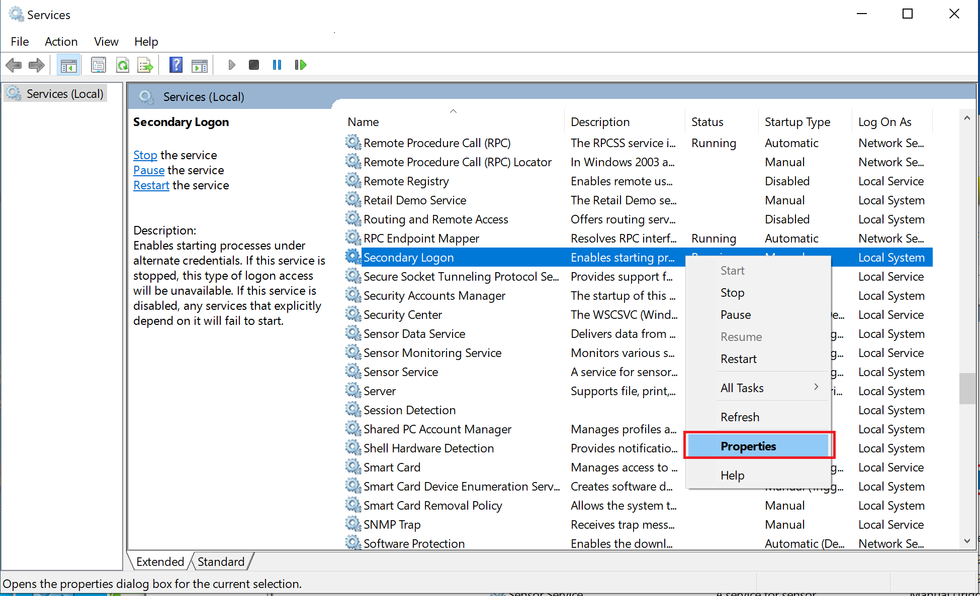 Set the startup type of it to Automatic. Right-click Secondary Logon and choose Properties from the shortcut menu.