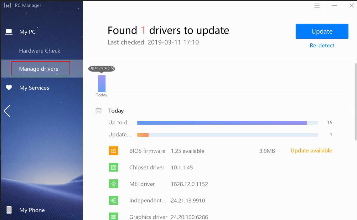 Open PC Manager and click Manage drivers.