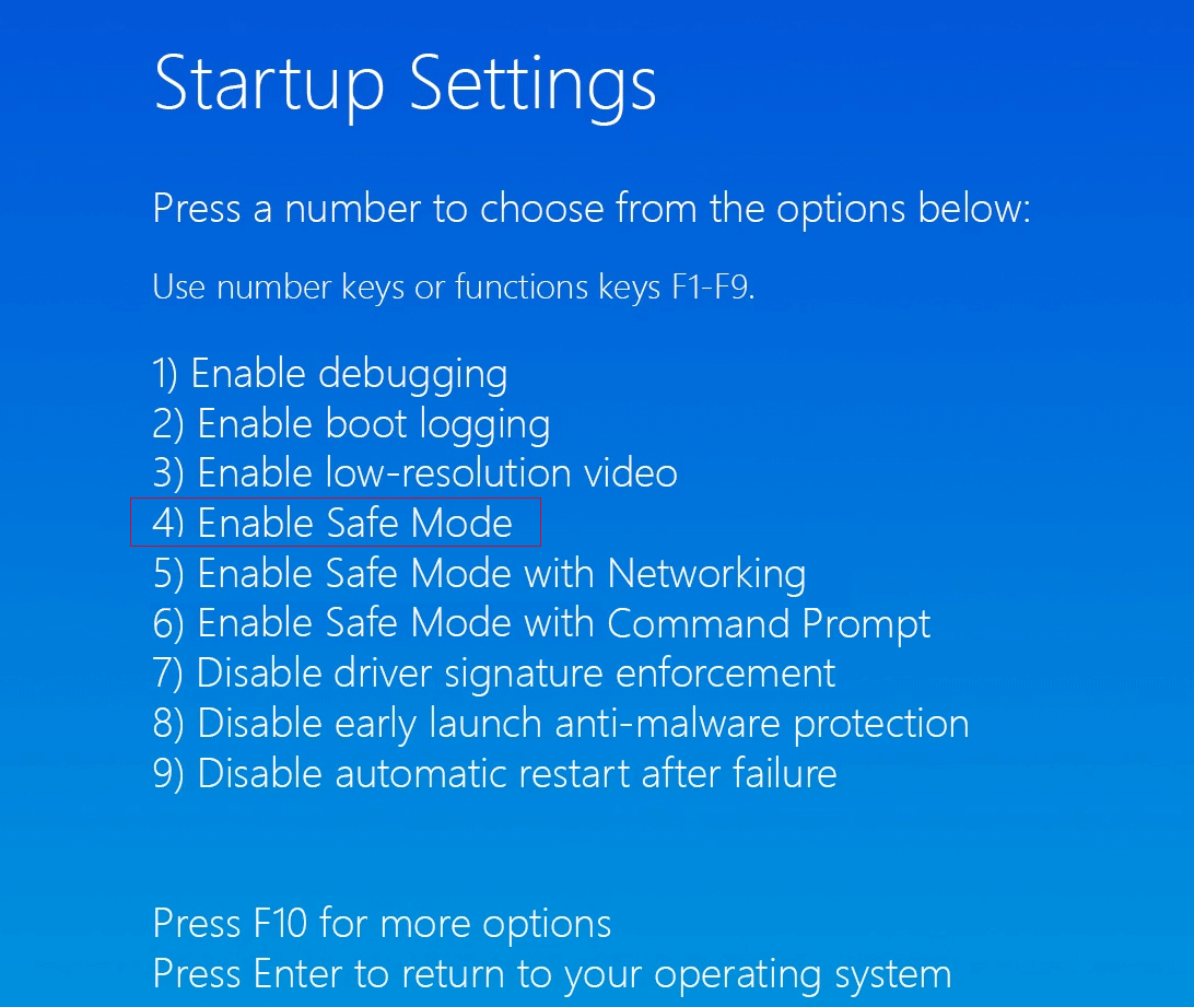 - Your computer will restart and automatically enter the Startup Settings screen after restarting. Press the 4 or F4 key and click Enable Safe Mode to enter Safe Mode.