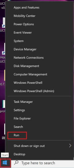 Right-click Start in the lower left corner of the desktop and choose Run from the shortcut menu.