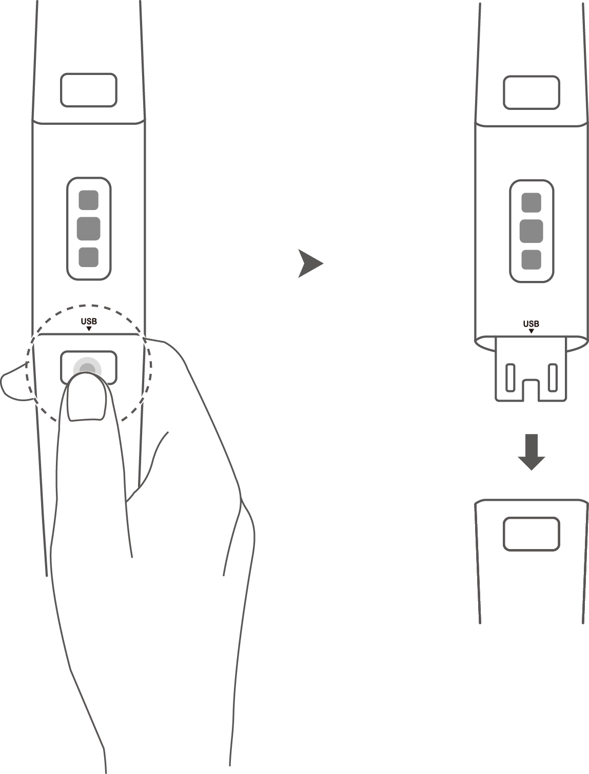 Press and hold the quick release button on the longer strap to detach the band body from the strap. Plug the band body directly into a power source with a USB port.