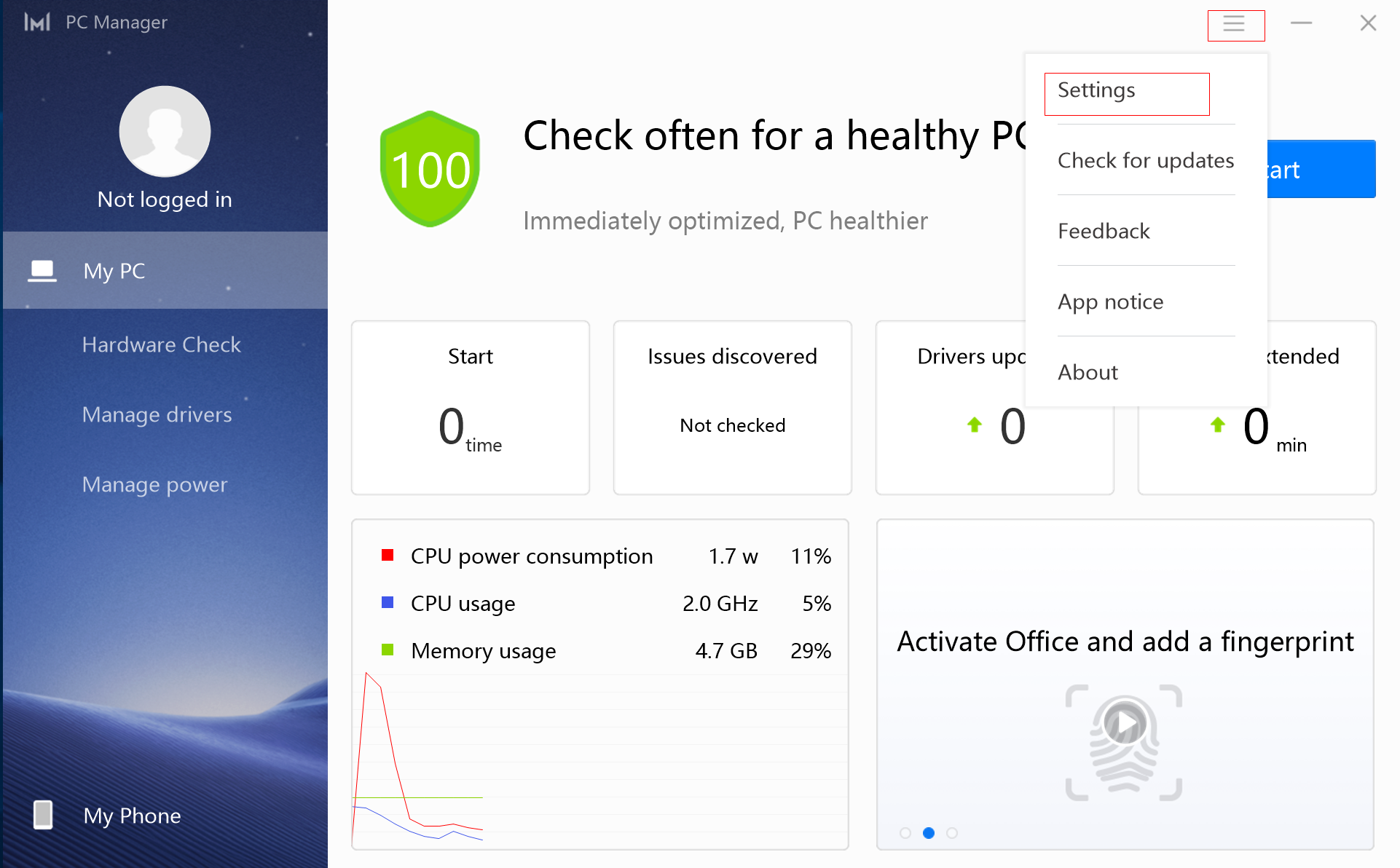 Open PC Manager, and click the settings icon in the top-right corner.