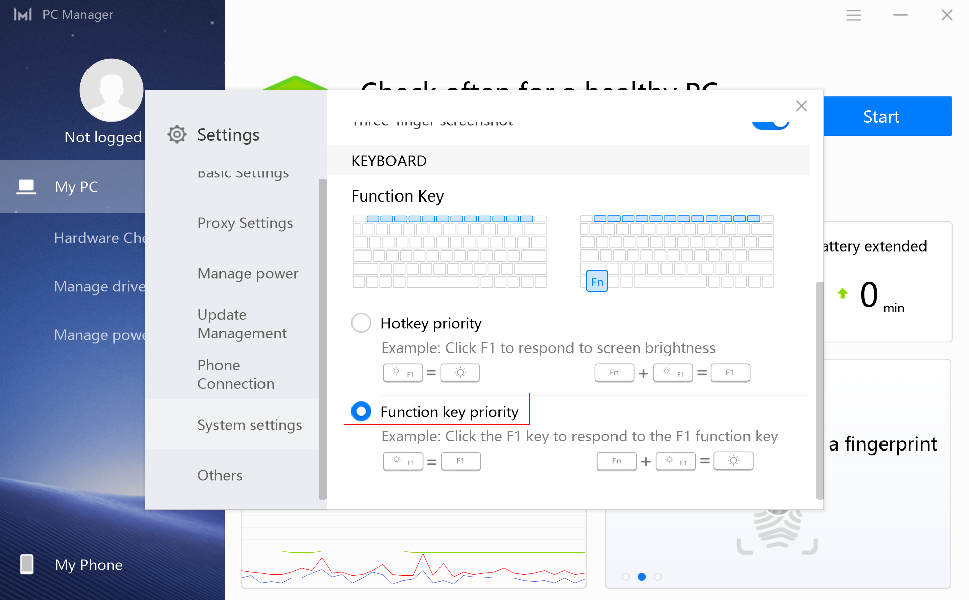 Check whether Function key priority is enabled in PC Manager.