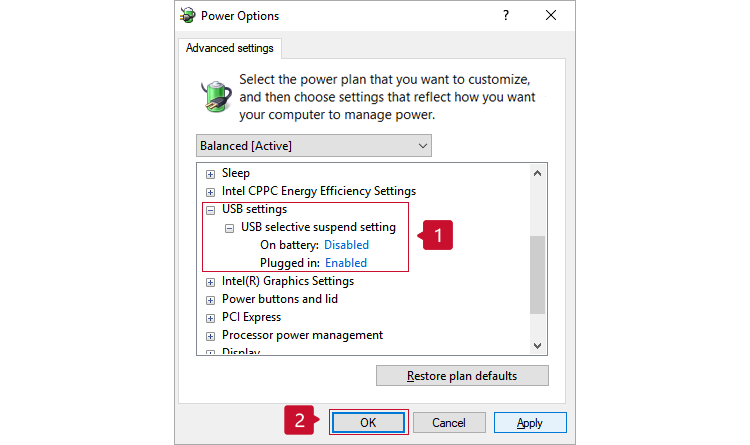 - Click the + icons next to USB settings and USB selective suspend setting, disable the USB selective suspend setting, and click OK. Then insert the USB device again.
