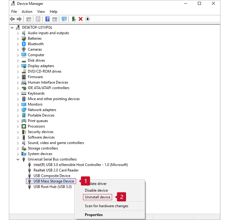 Open Device Manager, expand Universal Serial Bus controllers, click USB Mass Storage Device > Uninstall device , and then reinsert the USB device.