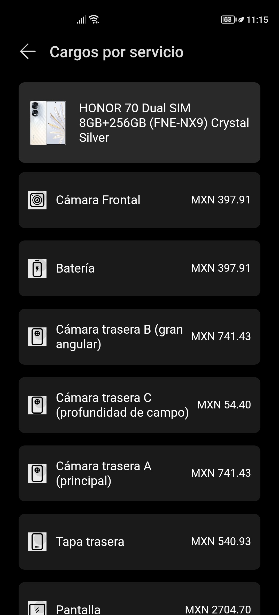 ¿Dónde encuentro los precios de las partes de repuesto en la app My HONOR?