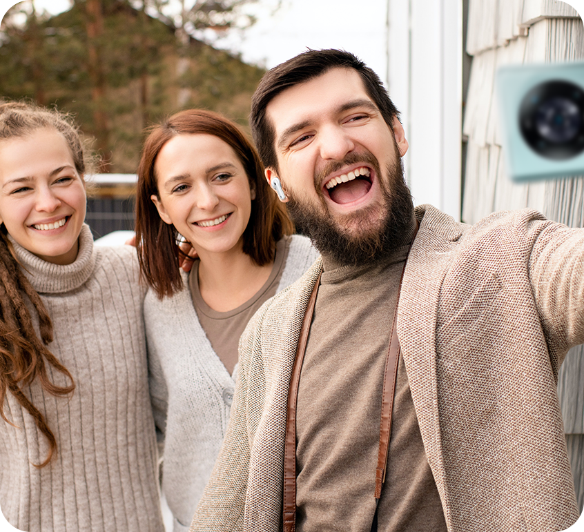 Grave um vídeo com o seu telemóvel. Ficará surpreendido com a qualidade de áudio cinematográfica, graças ao melhoramento da voz humana por condução óssea, à otimização dos efeitos de áudio e à redução do ruído de fundo e do vento.