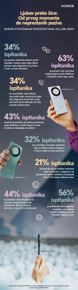 Kompanija HONOR je nedavno sprovela istraživanje u Srbiji, na uzorku od 500 ispitanika od 18 do 44 godine, koje pokazuje koliko su parovi povezani u različitim fazama veze. Istraživanje je potvrdilo da većina ispitanika, na samom početku veze, provede sa partnerom u proseku 30 minuta telefonirajući. Nakon dve godine veze, vreme provedeno „na telefonu” smanjuje se na 12 minuta.