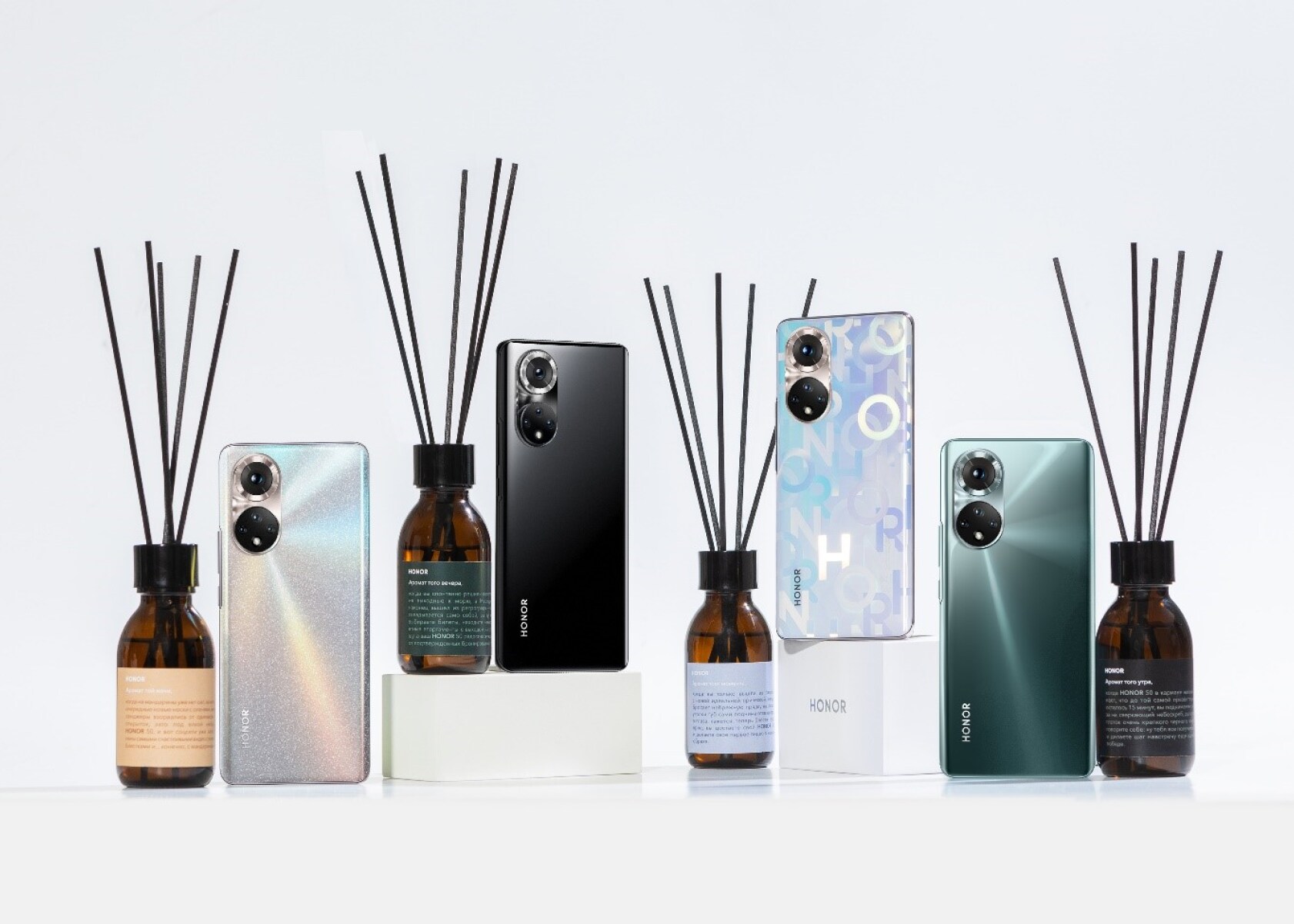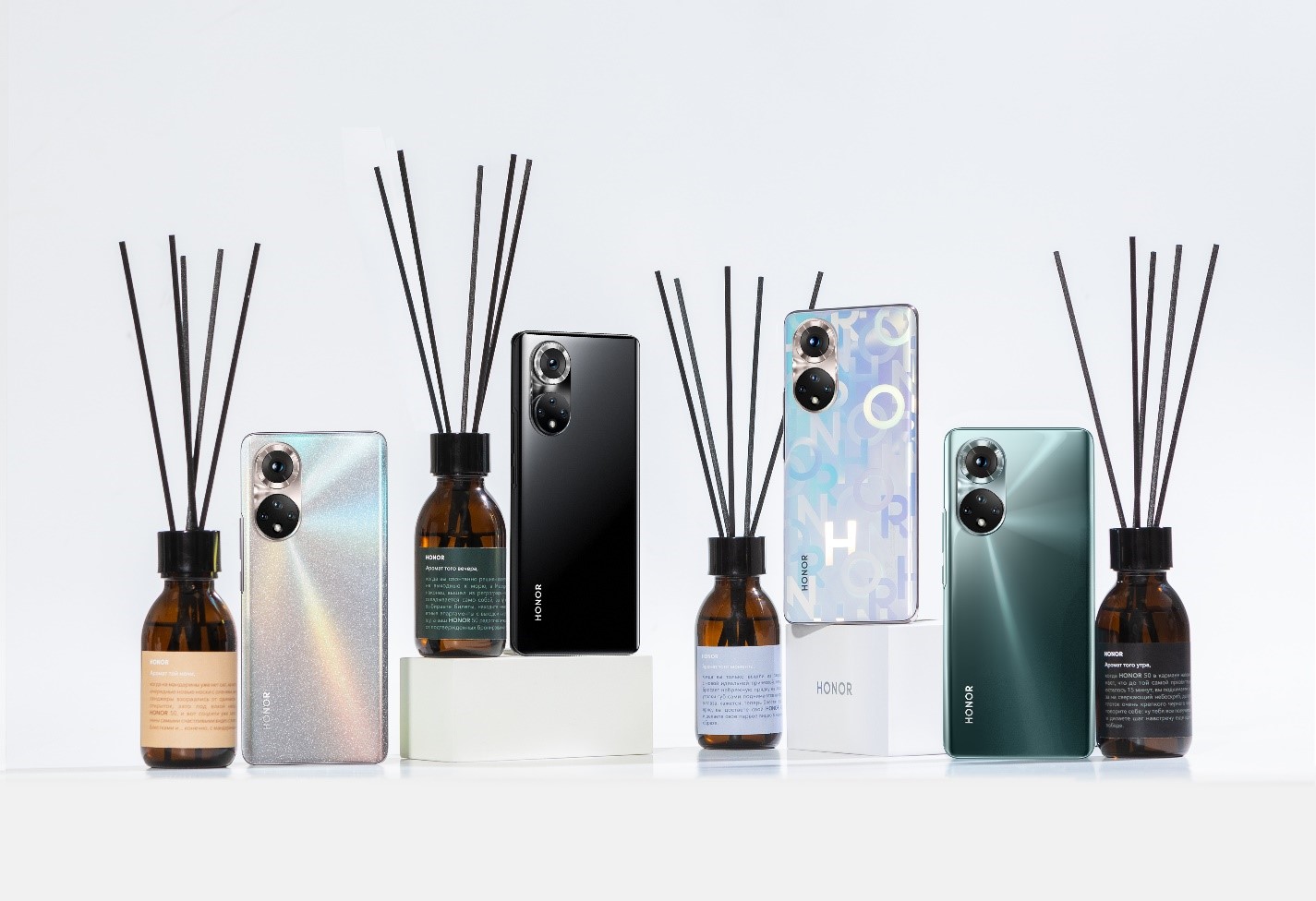 Москва, 16 декабря 2021 года — Компания HONOR выпустила лимитированную линейку ароматов для дома. Коллекция разработана в рамках рекламной кампании нового смартфона HONOR 50 и включает в себя диффузоры с ароматами, которые соответствуют дизайну каждого из четырех смартфонов.