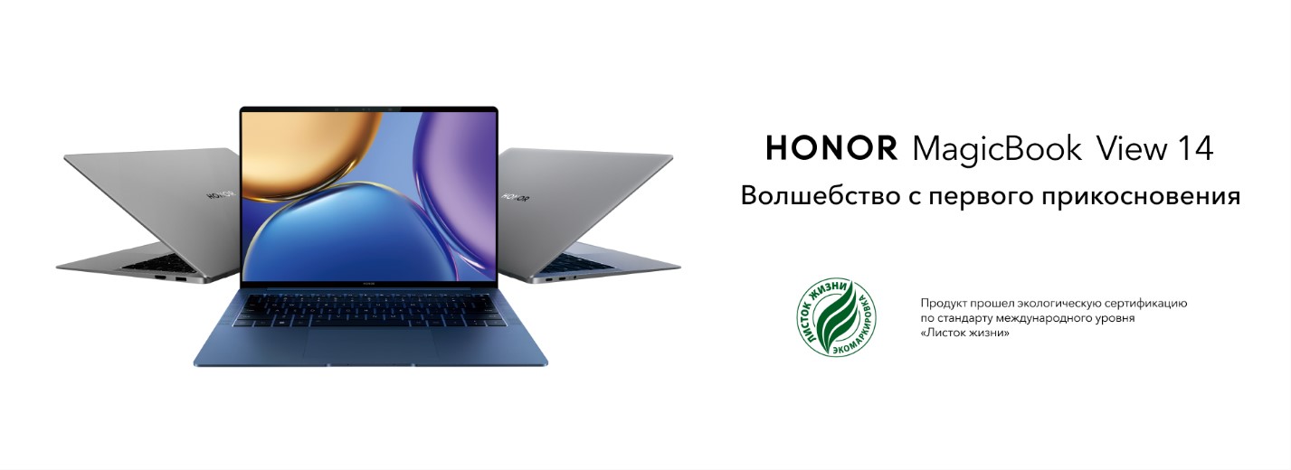 Москва, 10 февраля 2022 года — Ноутбук HONOR MagicBook View 14, продажи которого стартовали на российском рынке в конце 2021 года, стал первым в России ноутбуком, получившим сертификат российского Экологического союза и право на использование экомаркировки «Листок жизни», что гарантирует безопасность устройства для человека и окружающей среды.