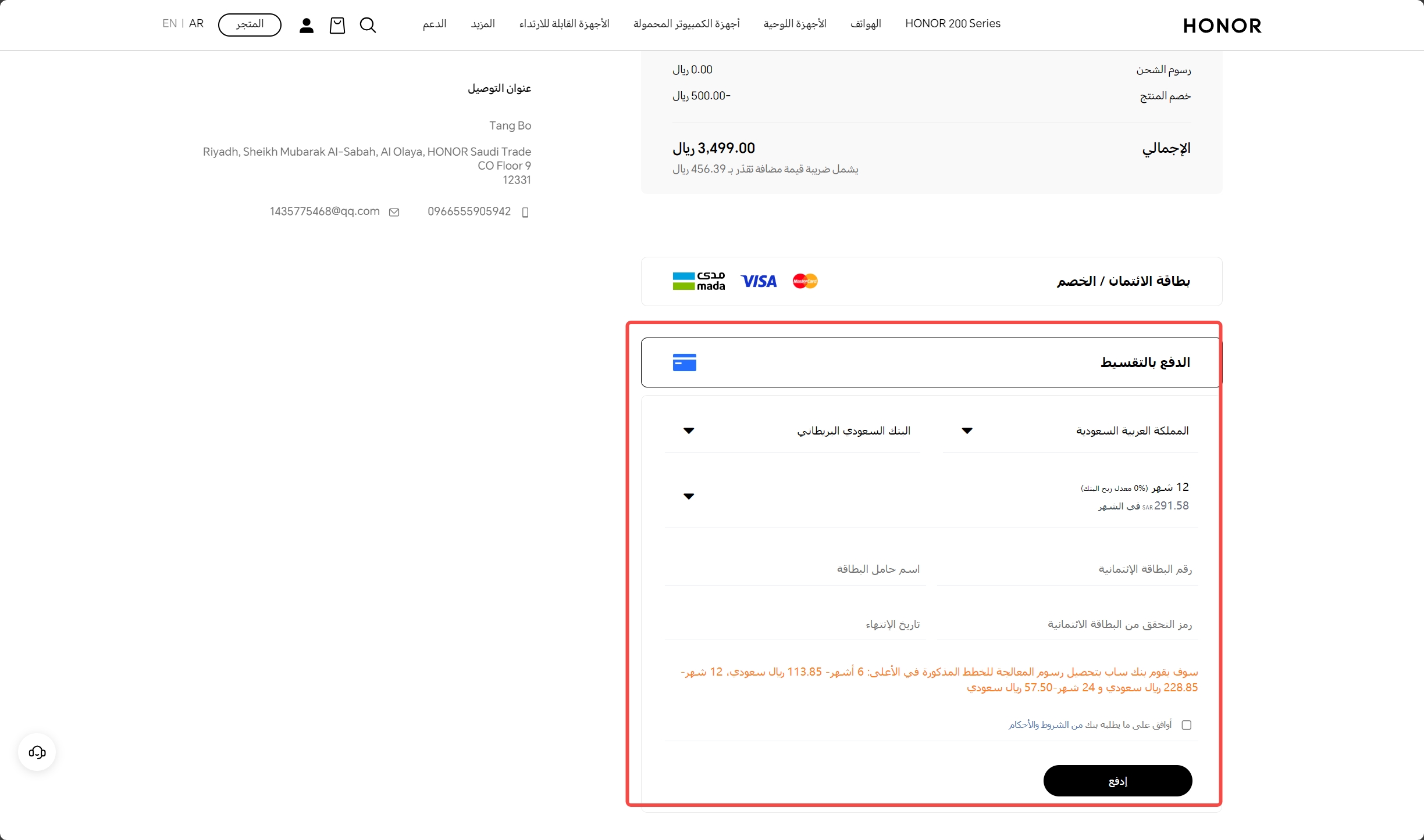 يعتبر نظام التقسيط إحدى طرق الدفع المتاحة على موقع honor.com/sa-ar/ ومع هذا الخيار، يتمتع العملاء بالمرونة في سداد طلباتهم من خلال أقساط شهرية متساوية. تنطبق طريقة الدفع بالتقسيط فقط على بطاقات الائتمان الصادرة عن بنوك محددة مدرجة على الموقع. عند تحديد هذا الخيار أثناء الشراء، سيتم تزويد العملاء بقائمة من البنوك الشريكة، يقدم كل منها أسعار الفائدة الخاصة به، ورسوم المعالجة، ومدة خطط التقسيط والسداد. من المهم ملاحظة أن تفعيل خطة التقسيط قد يستغرق من 10 إلى 15 يوم عمل، اعتمادًا على البنك الذي يتعامل معه العميل. تخضع خطط التثبيت وأي رسوم إضافية للشروط والأحكام التي يحددها البنك المعني، والتي يجب على العملاء الموافقة عليها قبل متابعة طريقة الدفع بالتقسيط. علاوة على ذلك، من الضروري أن تضع في اعتبارك أن خيارات التقسيط لمشتريات بطاقة الائتمان قد تختلف وفقًا لجهة إصدار البطاقة المحددة.