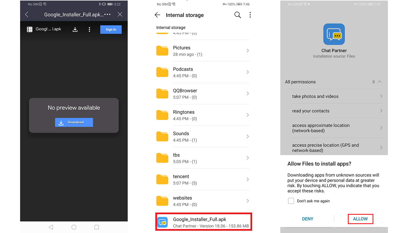 Download Google_Installer_Full.apk on your phone and install the app Chat Partner.