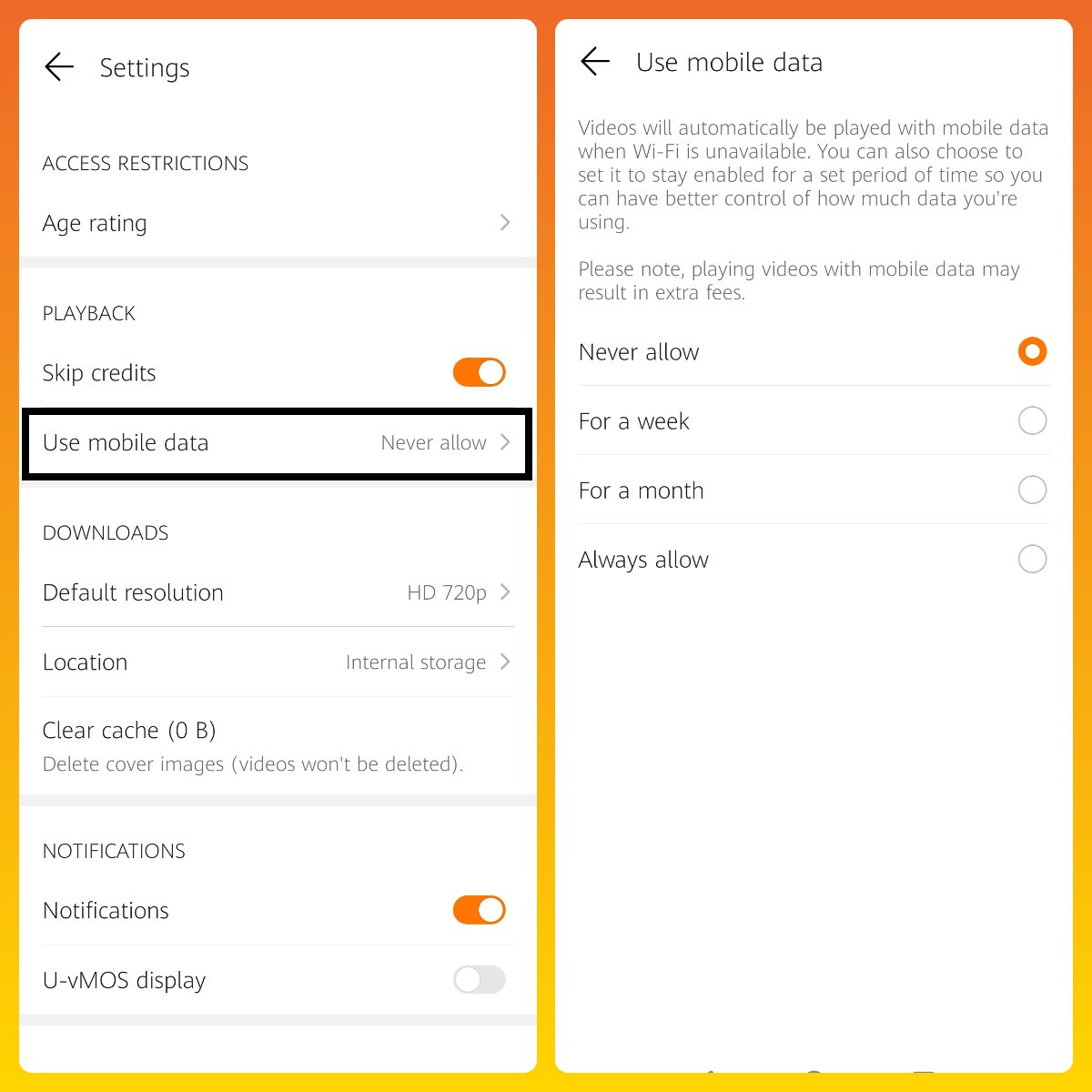 + Use mobile data | Videos will be played with mobile data when Wi-Fi is unavailable