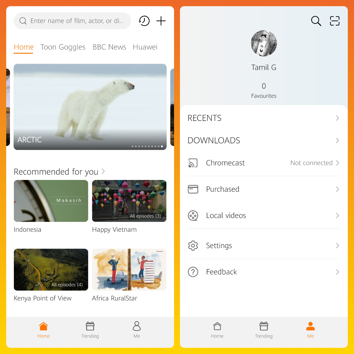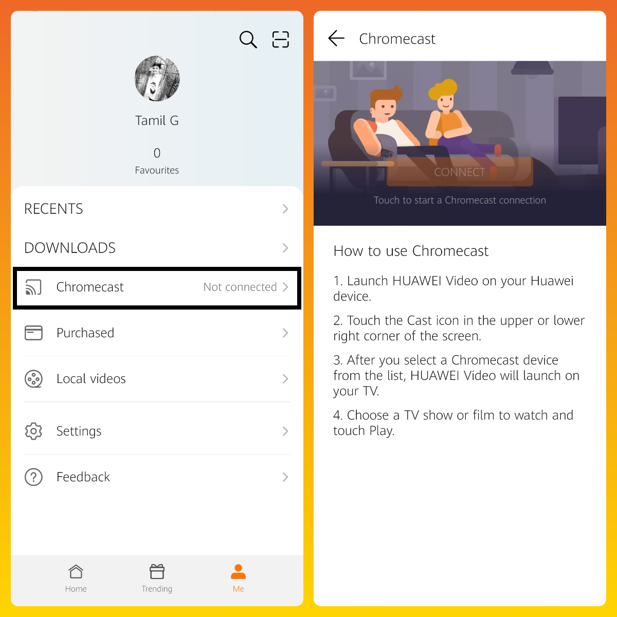 + Open HUAWEI Video App > Me > Chromecast