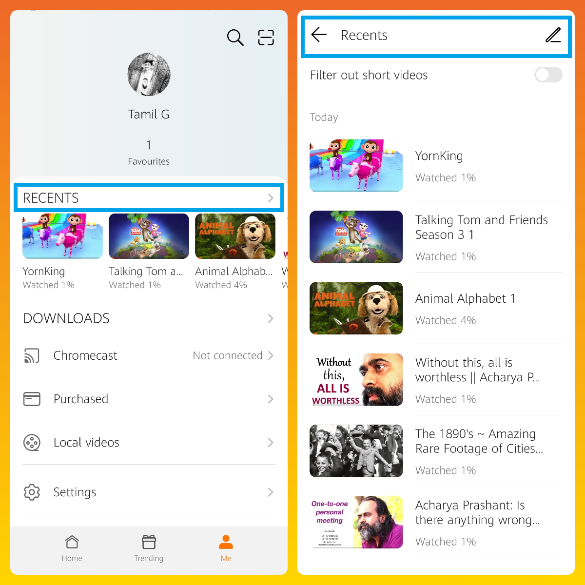 + One tap to access your recently watched Videos