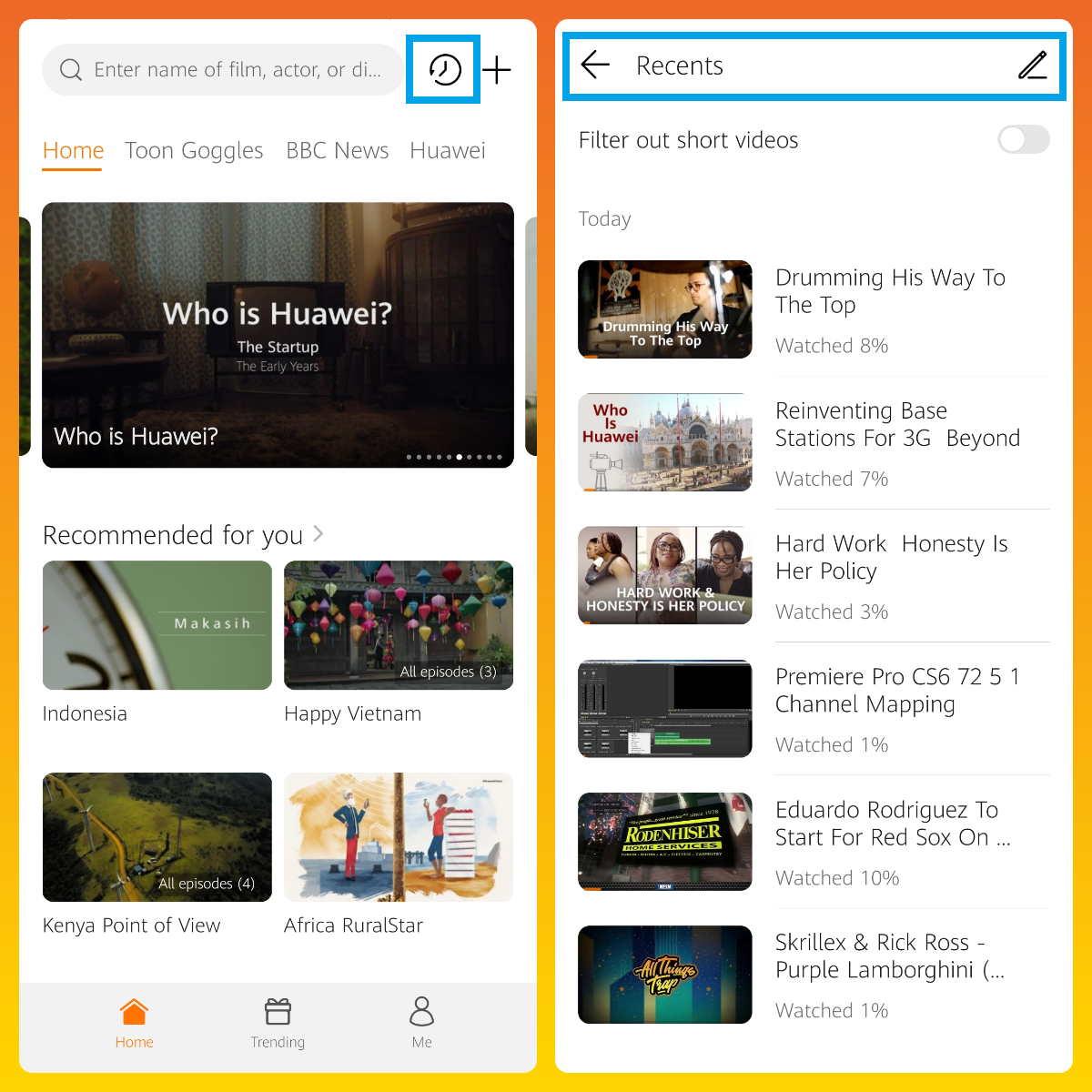 + It's great that HUAWEI Video shows - "How much percentage you've watched a particular video under it"