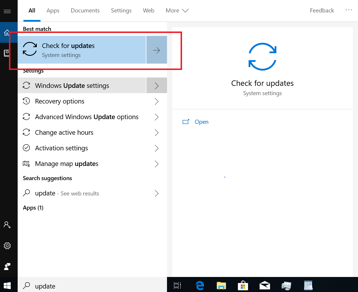 Update Windows. Enter Windows Update in the search box on the taskbar. Click Check for updates under Settings.